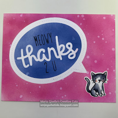 To create my card, I die cut the Lawn Fawn Stitched Speech Bubble Frames die, LF Sripty Thanks die and a cat die from the LF Spooktacular coordinating die on sheet of masking paper. I left the masking paper on the release paper. I only peeled off the speech bubble negative masking paper cut. I blended the Tim Holtz Faded Jeans Distress Oxide to this area being careful that I do not peel off the intricate scripty masking paper die cut. No matter how careful I was, some of it peeled off, having a bit of blue ink bleed which I have a fix later on.