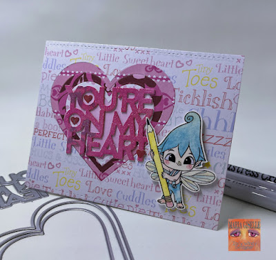 For the card panel, I trimmed a red patterned paper at 4" x 5 1/4". I die cut falling hearts to the middle of the panel using a die. I adhered this to a pink patterned paper cut at 4 1/4" x 5 1/2".