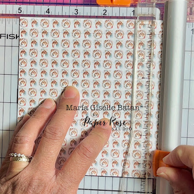 For the front of the card, I trimmed one of the 6x6 patterned papers to 4.5" x 4.5". I strategically cut this keeping in mind of what part of the background I want to be seen seen through the window on the cover.
